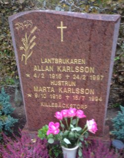 | Allan Sigvard Karlsson. Died 1997-02-24 in Grevie (L) [1] . | F Hilda Nilsson. Born 1871-08-26 in Hunseröd, Munka-Ljungby (L) [2] . Died 1944-12-01 in Grevie (L) [1] . | FF Nils Kjellsson. Born 1824-11-01 in Skräddarebygget, Oderljunga (L) [3] . Died .. ... 1902 in Hunseröd, Munka-Ljungby (L) [2] . | FFF Kjell Eliasson. Born 1785-03-09 in Bälinge, Oderljunga (L) [4] . Died 1833-07-28 in Bälinge, Oderljunga (L) [5] . | FFFF Elias Jönsson. Born Troligen between 1731 and 1732 in Algustorp, Röke (L) [6] . Died 1808-05-02 in Bälinge, Oderljunga (L) [7] . |