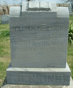 | F William Eldridge Jenkins. Born 1826-04-10 in Rappahnnoch Co, Viginia, VA (USA). Died 1914-01-27 in Colfax, McLean Co, IL (USA). | F Morris Jenkins. Born in USA. | |||